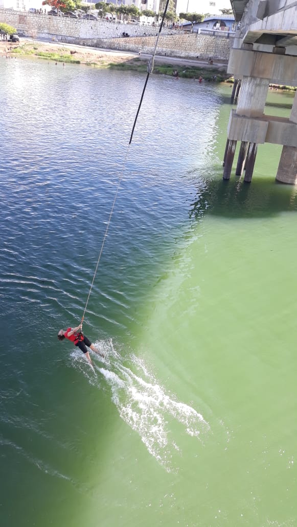 Já saltei de frente, mortal (essa era minha meta), de costas, sem segurar as cordas... mas nunca toquei na ponte (isso não era bem a minha meta), mas agora é...